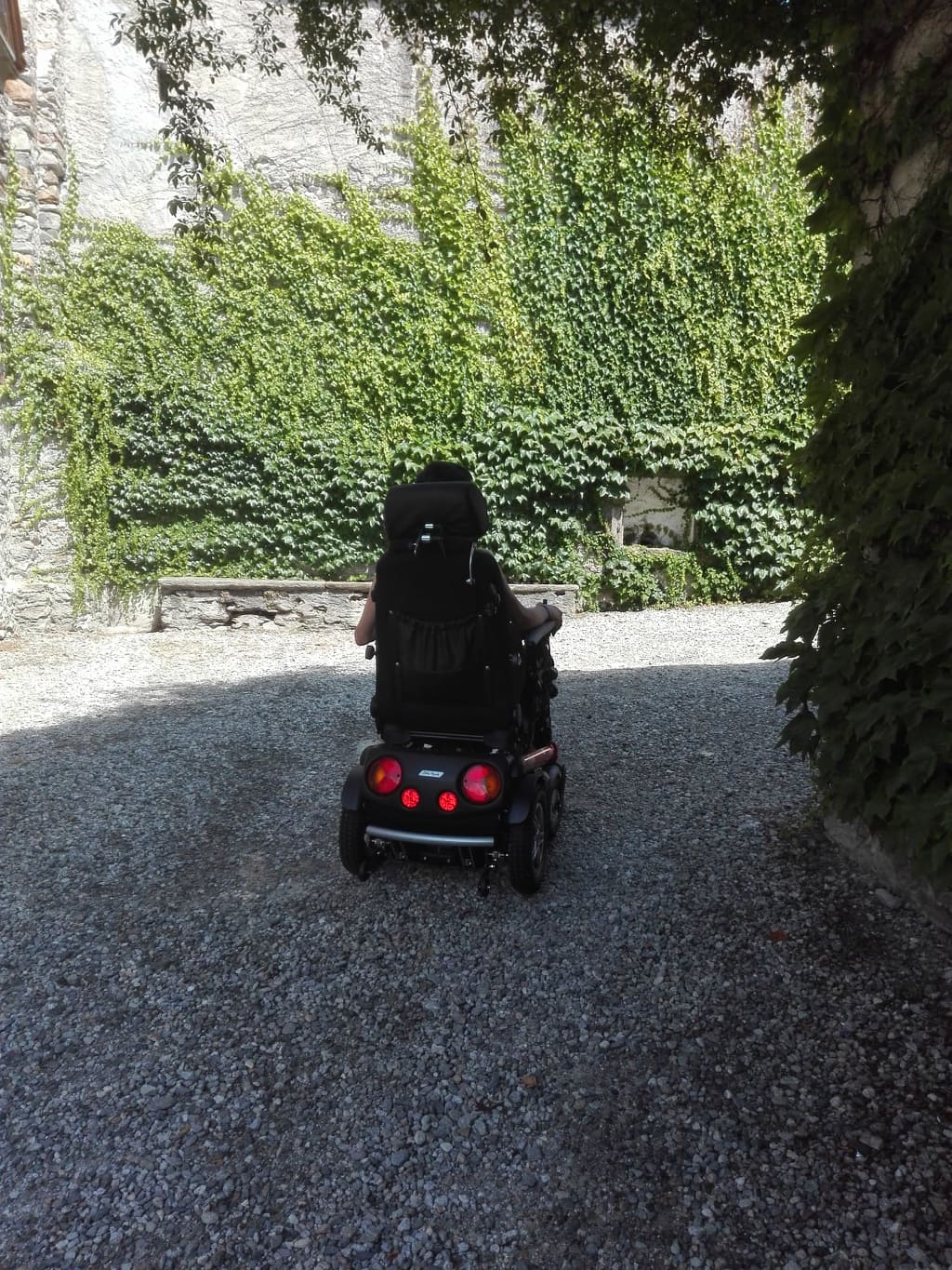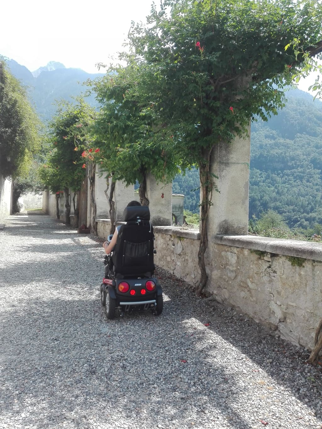 Ralph, il custode, ci aspetta. Attraversiamo il ciottolato: senza fatica grazie alla carrozzina elettrica! Alla nostra destra gli orti e un poetico panorama!