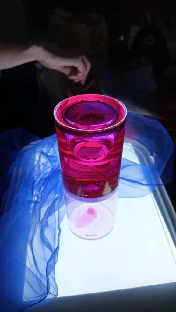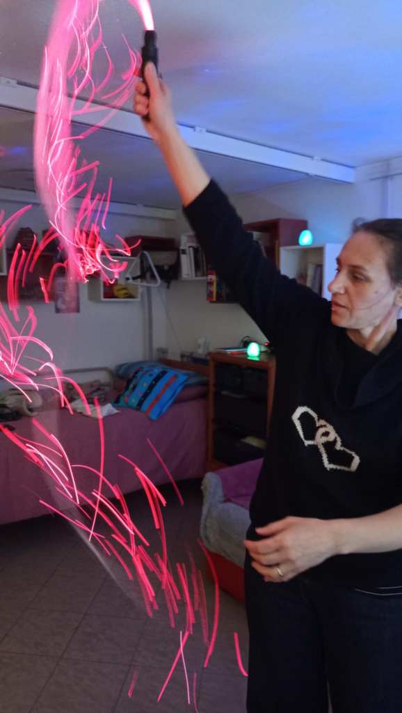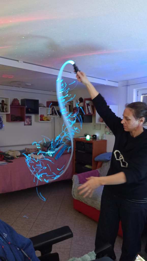 Ma prima dell’intervista Silvia ci ha fatto una sorpresa ed ha allestito la mia camera con tutta una serie di oggetti e strumenti che usa per la stimolazione multisensoriale e cosi abbiamo potuto fare una breve esperienza guidata su cosa è quest’attività terapeutica rivolta in particolare a persone con alzheimer, autismo e altre disabilità.