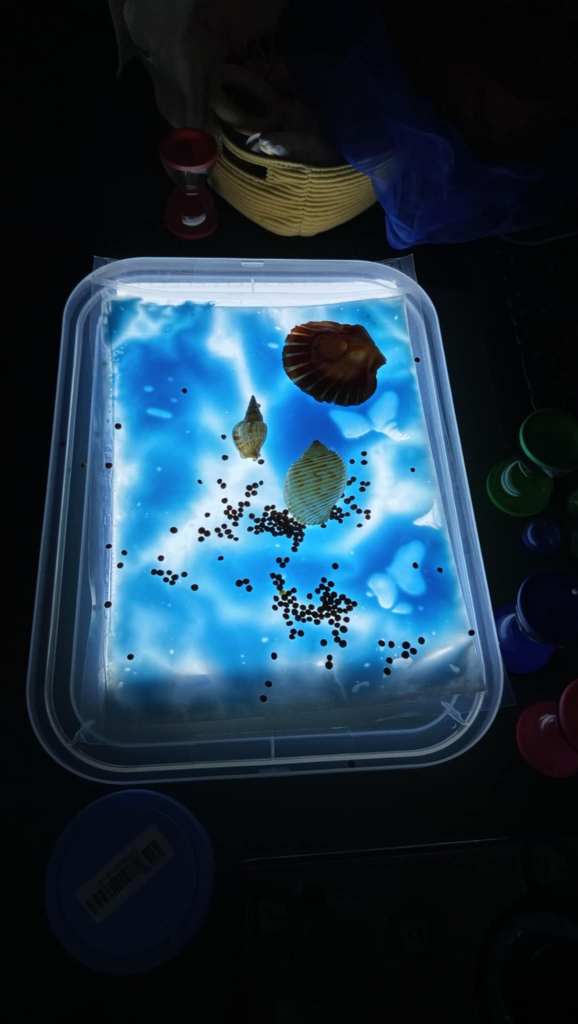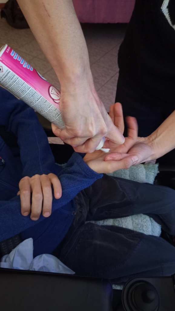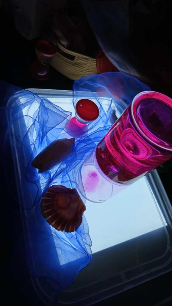 (nelle foto sotto Silvia ci ha portato alcuni oggetti per la stimolazione dei vari sensi come una schiuma speciale e un set essenze profumate molto interessanti )